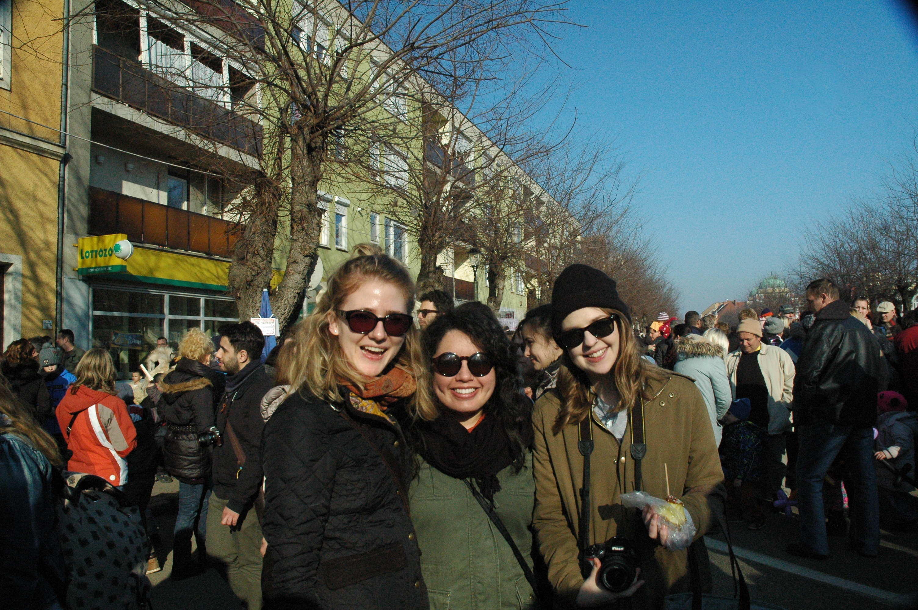 The sheer amount of people attending the festival was overwhelming. During the parade my students and I had to peek through tiny holes between people to catch brief glimpses of the Busós. After watching for a while, some my students decided to sit off to the side for a bit. Dani, Carlyn, and I sat on the “cold” ground, to which we received shocked and appalled stares from passersby. In Hungary it is a common belief that people (namely women) can catch colds by sitting on cold surfaces. It was here that we realized that our calls could not go through to the other group. Awesome! After sitting in our spot off to the side for a bit, we decided to go to a fountain near the main square. It was on steps, so we hoped that the other group would be able to spot us more easily if we hunkered down there. I tried to contact the other group for the better part of two hours. I repeat: two hours. In order to entertain some of my students, I loaned them my DLSR. I now have about 200 pictures of attractive men, a random baby, and hilarious candids of my students. To all those planning on going on a field trip here, do not split up. One of my calls finally went through, to which we all celebrated like I did when Spain won the World Cup in 2010.