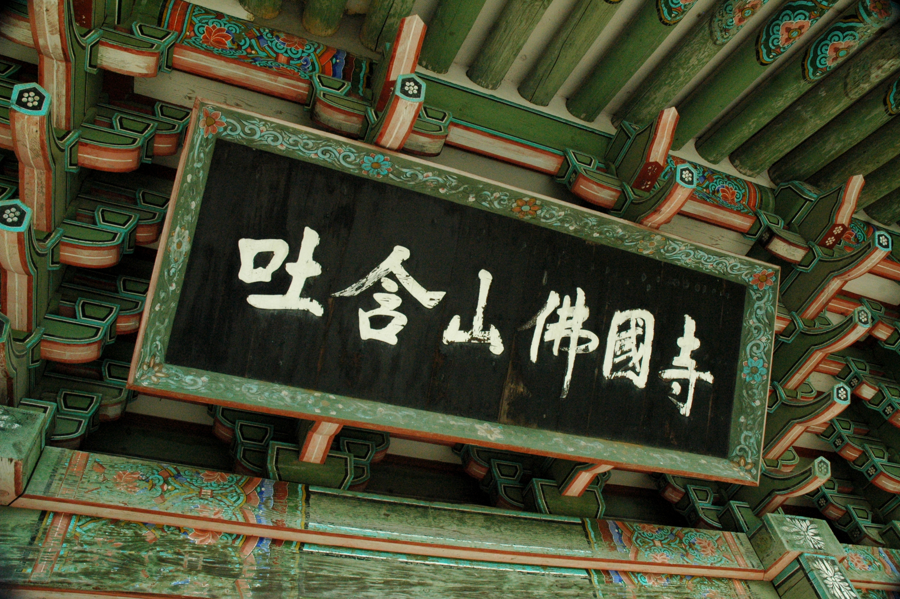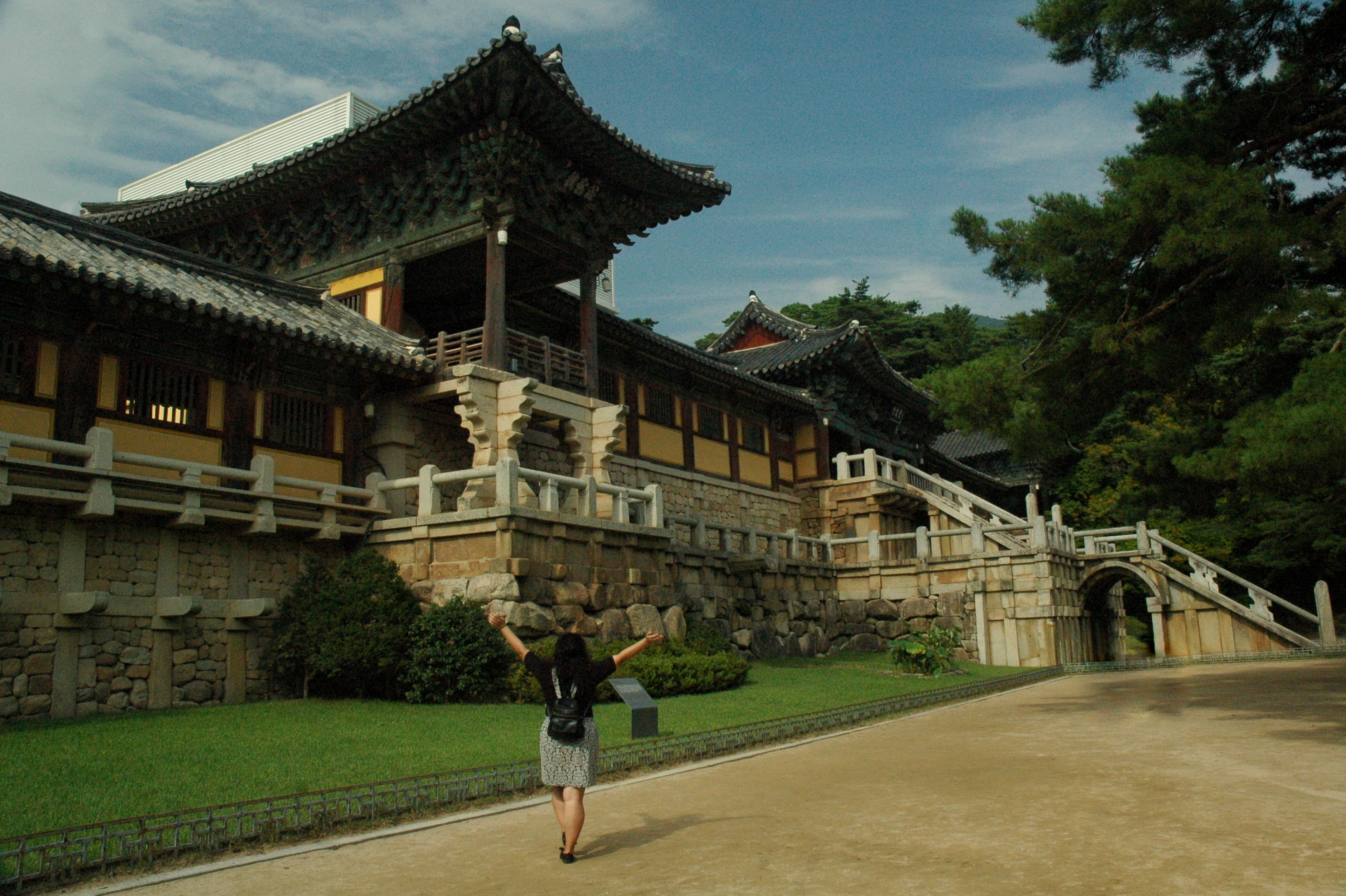 The construction of this temple began in 751 and was completed in 774. Like Haedong Yonggungs Temple, Bulguksa was burned down by Japanese invaders in the sixteenth century. Not far from the temple is the Seokguram Grotto. Due to time constraints, we could not visit it. Inside Seokguram is a “monumental statue of the Buddha looking at the sea in the bhumisparsha mudra position” and is “considered a masterpiece of Buddhist art in the Far East.” In 1995, the Seokguram Grotto and Bulguksa Temple were designated as world cultural heritage sites by UNESCO. Bulgusksa is divided into three areas: Birojeon, Daeungjeon, and Geungnakjeon. Daeungjeon Hall, the Hall of Great Enlightenment, enshrines Sakyamuni Buddha who attained enlightenment 2,500 years ago.