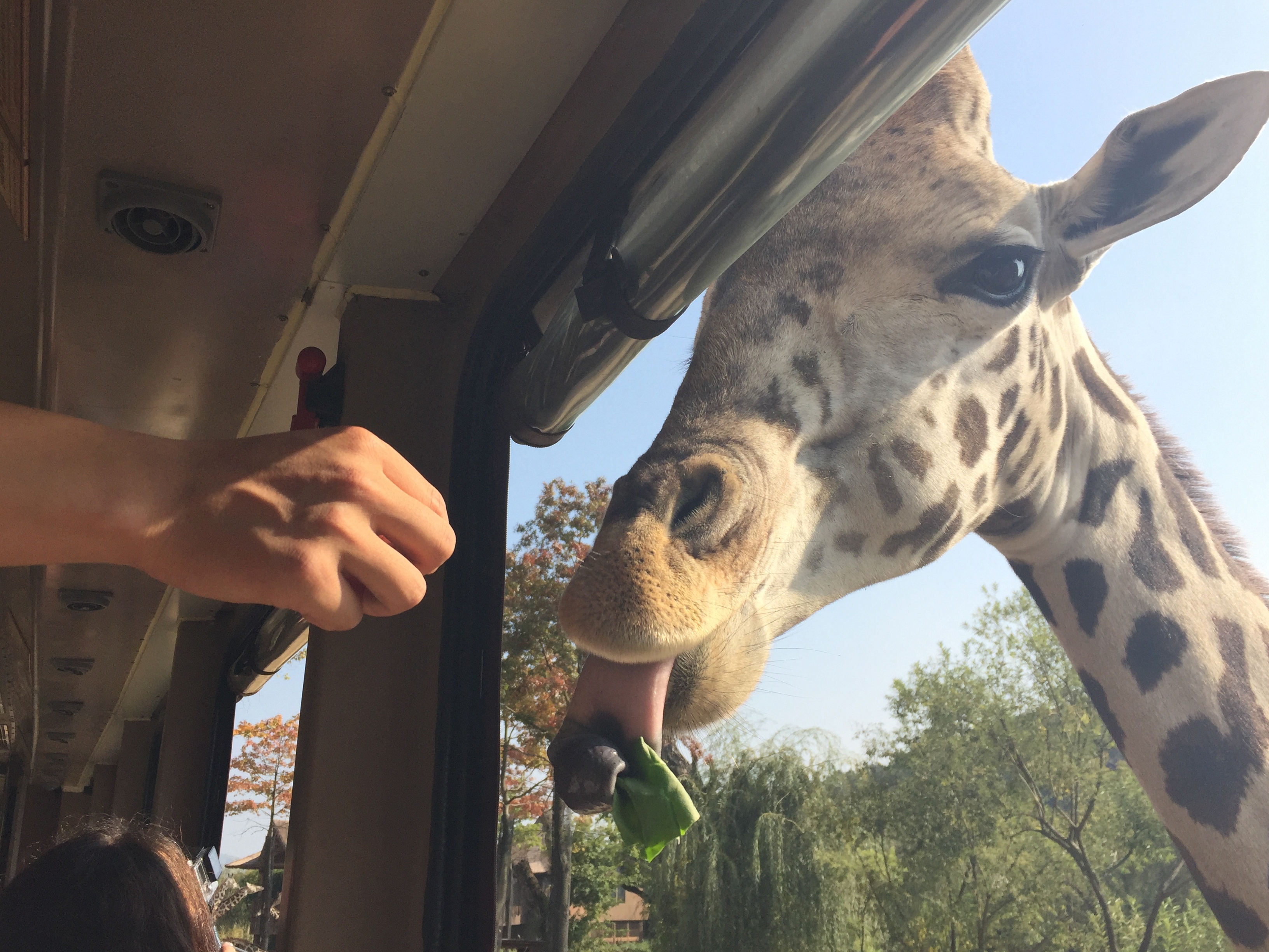 Fortunately for the rest of group, I am an overly prepared traveler and printed out several copies of a discount coupon. Everyone, with the exception of Nicole (she is Korean), ended up paying ₩24,000 ($21.21) instead of ₩48,000 ($42.43) because foreigners can get special discounts (check the website to see what is available). We made our way to the Zoo Topia section of the park and got in a lovely two-hour line for the Lost Valley ride. Nicole taught me “Come here!” in Korean, so I yelled that at every animal. My favorite part of the safari experience was when a giraffe came to the bus to be fed by the [super cute] guide. As I was trying to convince the animal to come my way (“안녕! 이리와!”), the guide brought some leaves to the window and motioned for me to take a selfie with the giraffe. My look of excitement in the pictures is too frightening to share with you all. One of the things I wanted to do most in Everland was to get headbands and I succeeded. I got a fennec fox headband for me, and a giraffe one for Nicole as a birthday gift (her birthday is today).