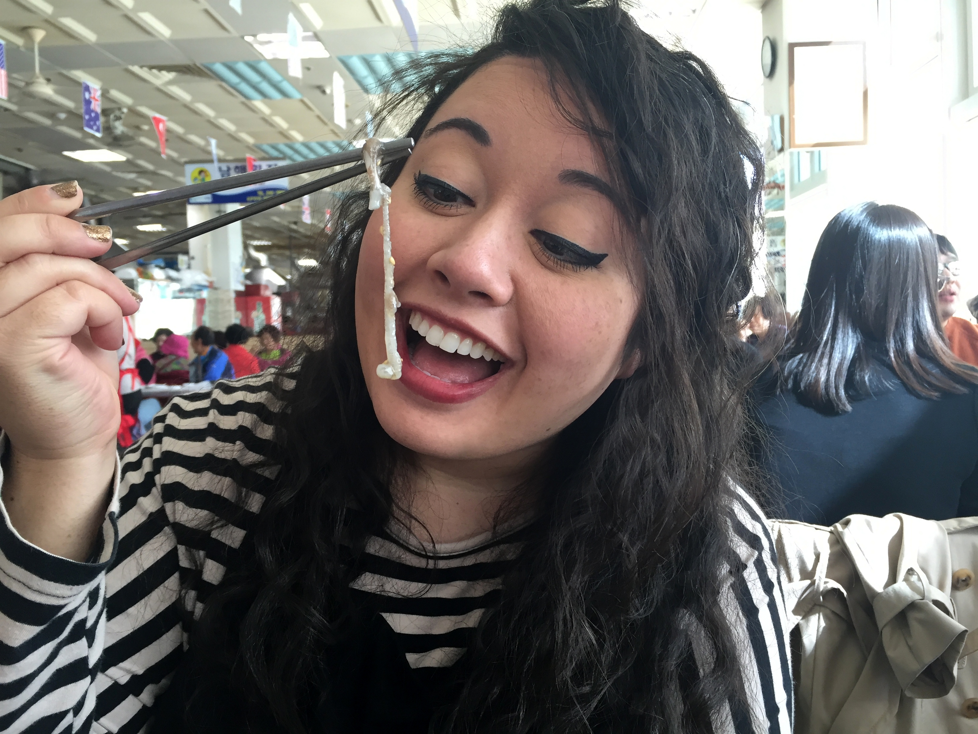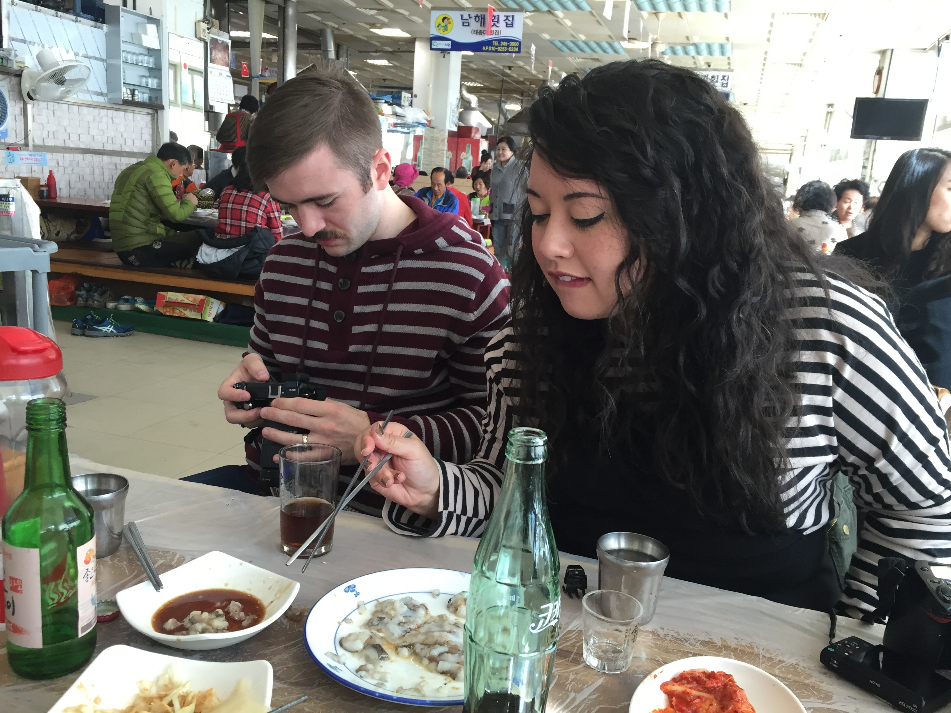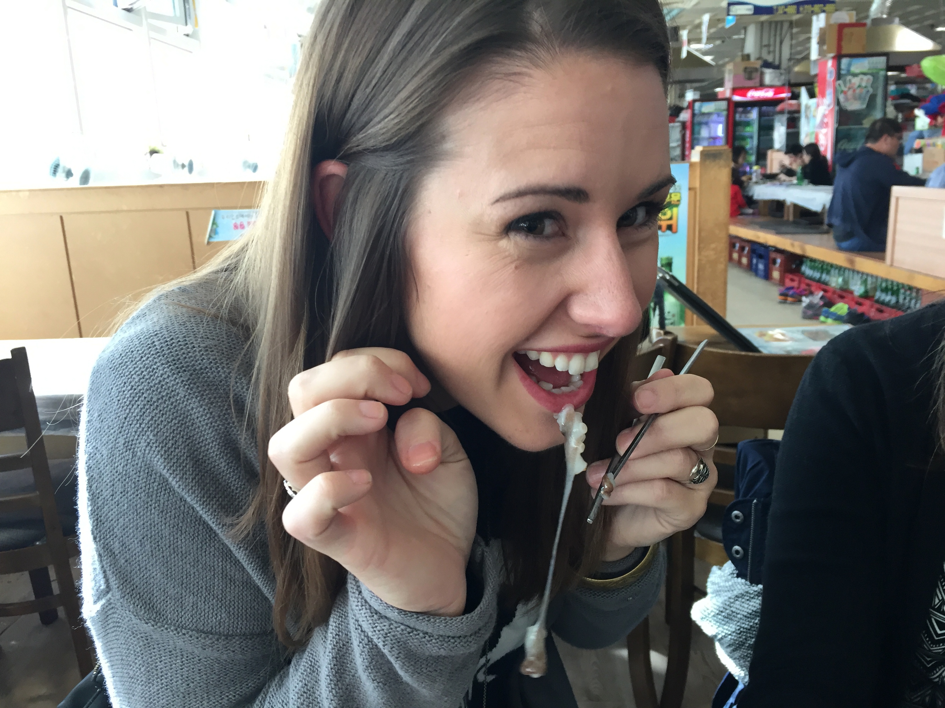 As I have previously mentioned, sea life frightens me. Knowing that we were going to actually eat in a market full of renegade squid (not an exaggeration – we watched one try to escape) made me panic more than just a little. Monica, Brent, and I quickly showed Emily the infamous “penis fish,” then made our way up to the eating area. I tried desperately to keep my cool. I abhor being loud in public places and did not want to make a show. Unfortunately, Brent’s hand got the brunt of my fear – I squeezed it so hard his wedding ring left painful, lasting indents in his pinky and middle fingers. Thanks for the support though, B. Oh, and thank you for ordering that bottle of soju. Liquid courage tastes delicious from time to time.